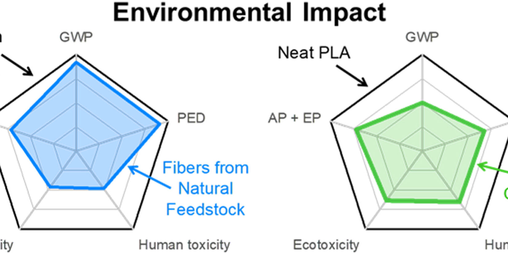 The LCA results show that the PLA matrix is the most impactful phase, nullifying the differences in environmental impact between the fiber types – of which the pine needles have better environmental performance, especially for ecotoxicity indicators. As a general result of the study, the higher the natural fiber content in the green composite, the higher the environmental benefits with respect to neat PLA.