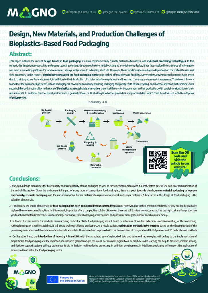This poster offers a concise summary of the project’s abstract and key conclusions, capturing MAGNO’s mission to transform the food packaging value chain through circular and sustainable approaches. It highlights the challenges addressed, our methodology, and the early outcomes — making it a great introduction to the scientific foundation and expected impact of the project.